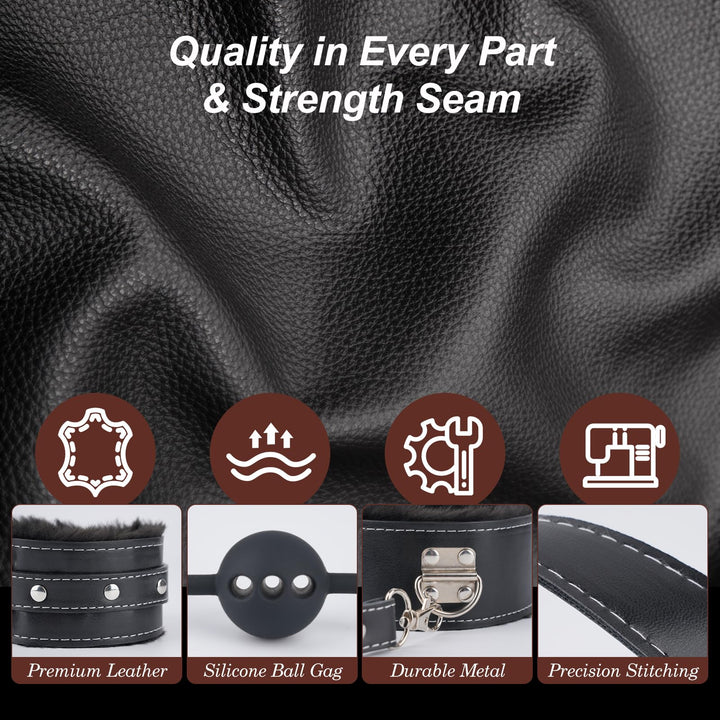 Include bavaglio in silicone, polsini in similpelle e cuciture rinforzate per sicurezza, comfort e uso a lungo termine.
